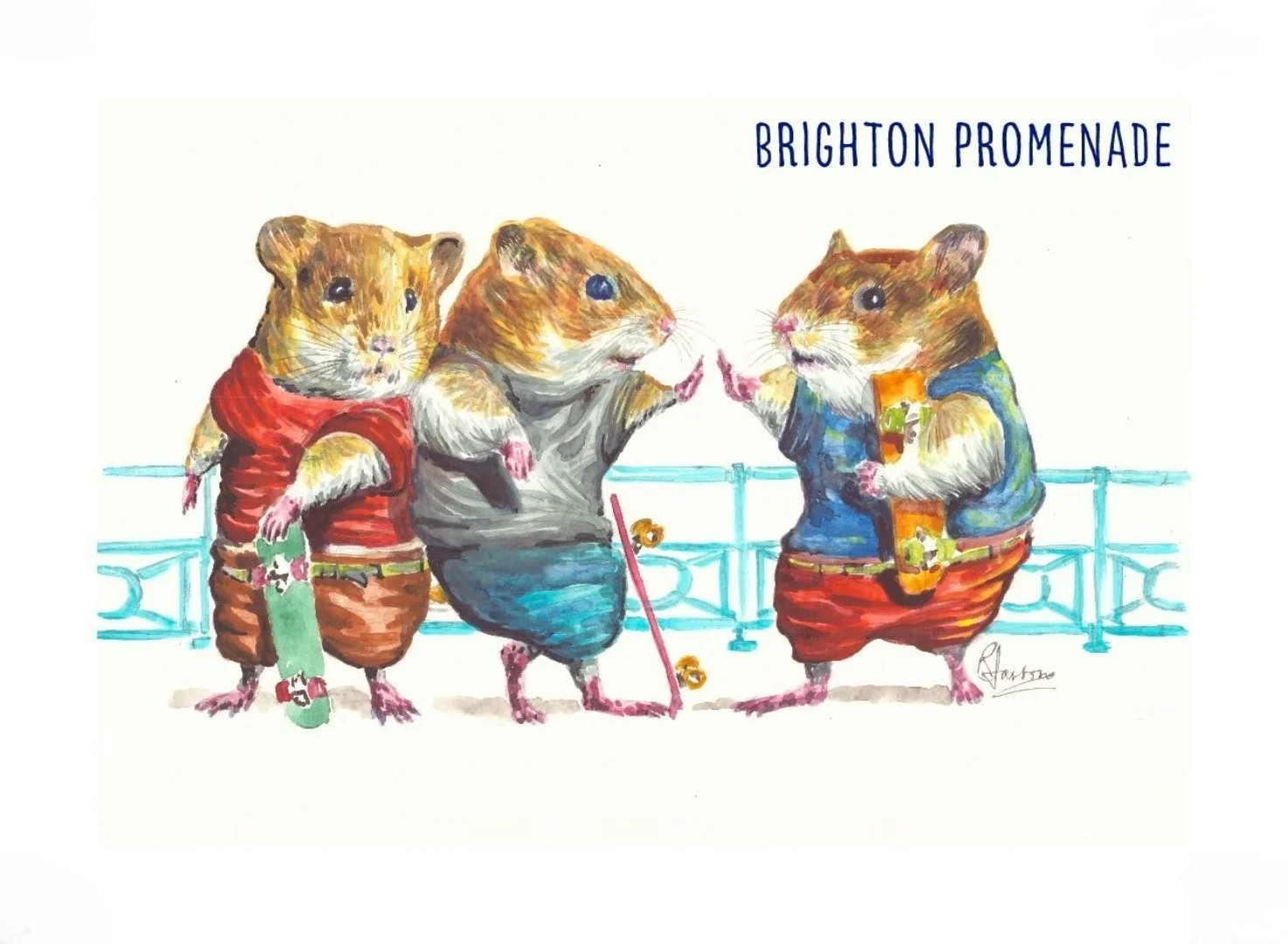 My art is mainly centred around drawing and watercolour painting. Within these elements I explore the humour, character and strangeness of everyday life in Brighton. My paintings cover quite a big range of subject matter: people, mech figures, bears, hamsters, squirrels, seagulls and monkeys 🐒 . I'm inspired by both realistic illustration and cartoons. I think my art art lies somewhere between these two.